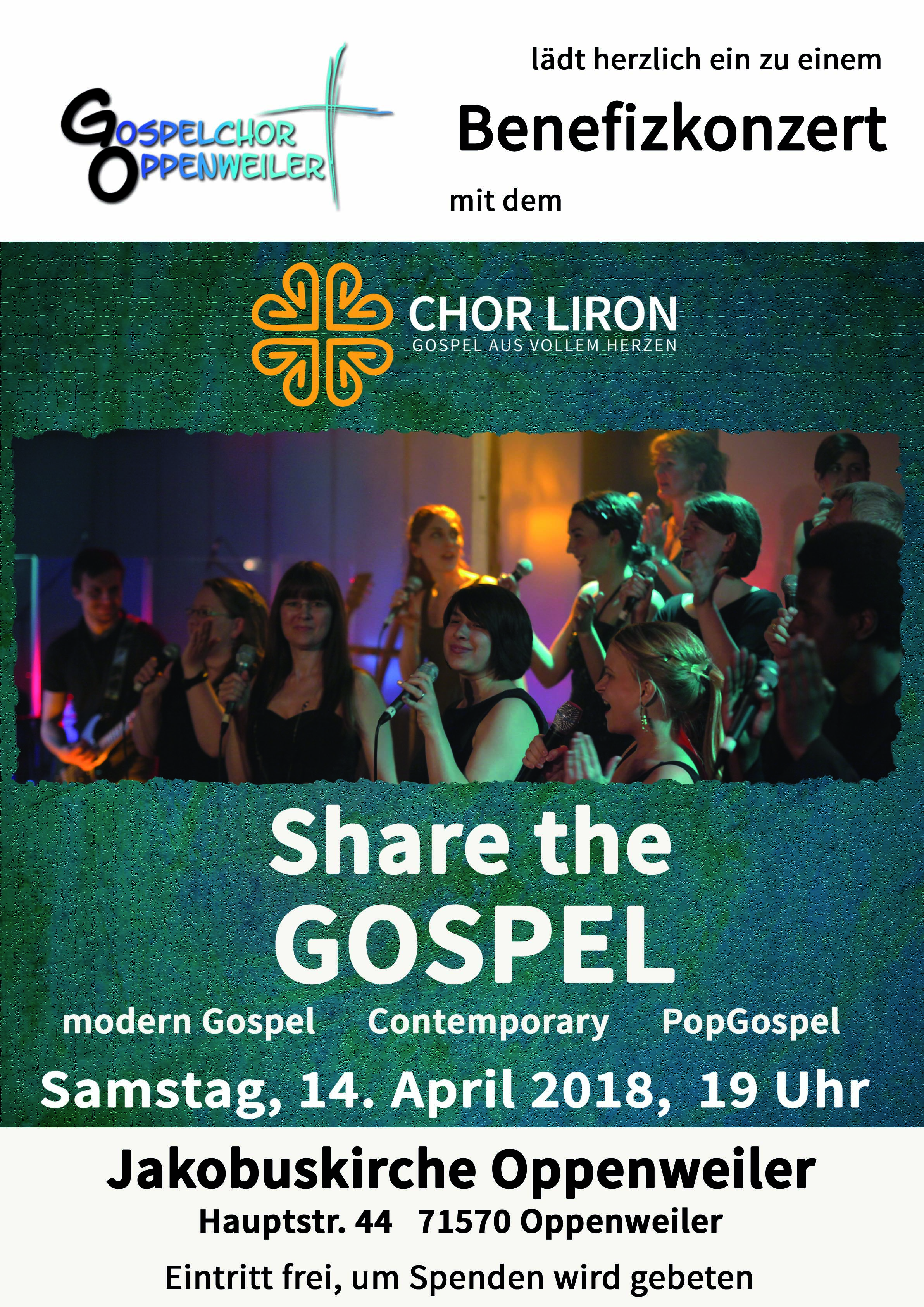 Nachdem wir den Gospelchor Oppenweiler am 03.03.18 bei uns in Tübingen zu Gast hatten und einen tollen Konzertabend erleben durften, sind wir nun bei ihnen eingeladen: am 14.04.18 um 19 Uhr werden wir in der Jakobuskirche in Oppenweiler unser Gospelprogramm "Share the Gospel" zum Besten geben. Wie immer ist auch unsere achtköpfige Band mit an Bord. Wir freuen uns über zahlreiche Besucher.